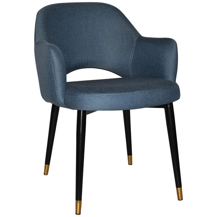 Albury Commercial Grade Gravity Fabric Dining Armchair, Slim Metal Leg, Denim / Black Brass