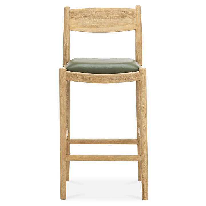 Calum Leather & Teak Timber High Back Counter Stool, Olive / Natural