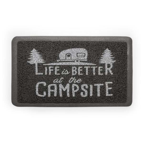 Camco Gray Scrub Rug. 53200, 1 Year Warranty. Stylish “Life Is Better at the Campsite” door mats are great for home, outdoors, under a pet bowl or camping! Use them to help trap dirt and debris to prevent bigger messes. Looped PVC material dries quickly, provides a cushioned step and is easy to clean. This mat comes in gray with a white “Life is Better at the Campsite” logo. It measures 26 1/2-inches x 15-inches.