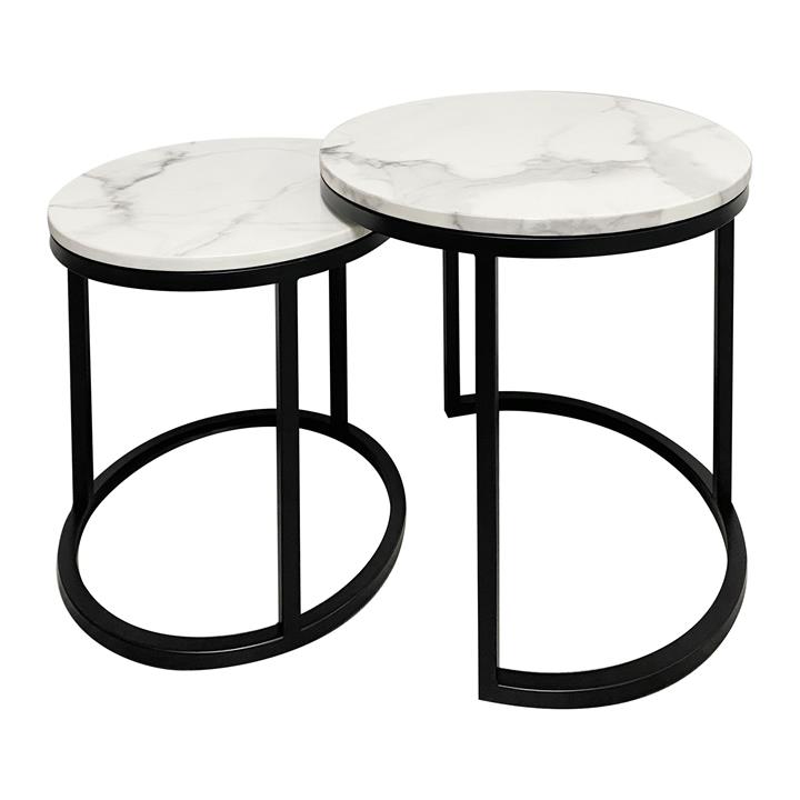 Crown 2 Piece Stone & Metal Round Nesting Side Table Set, White / Black