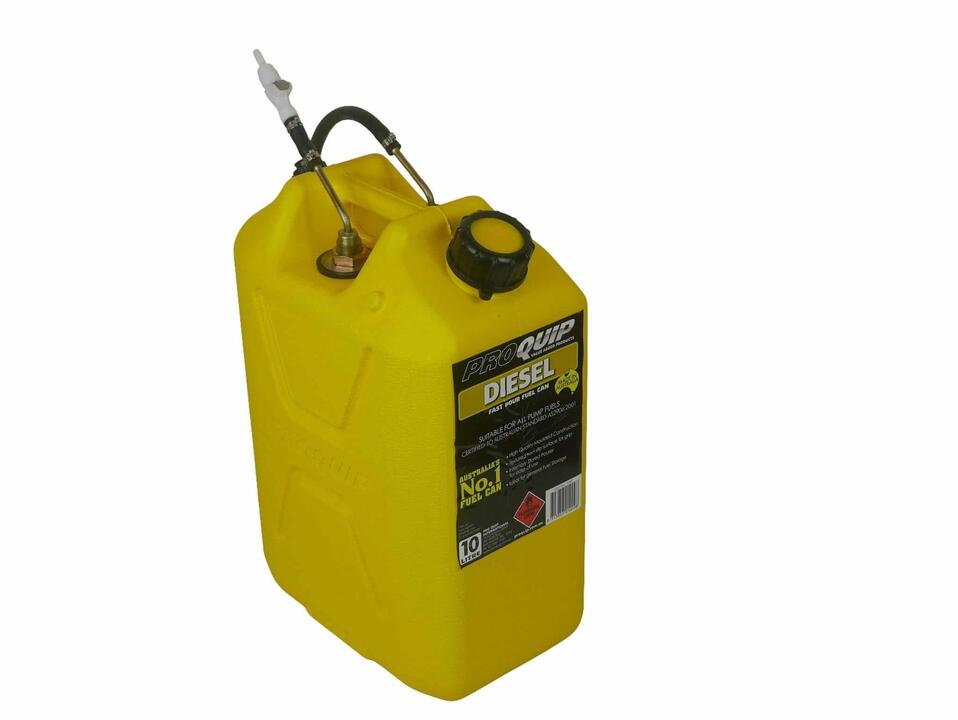 Dieselheat 10 Litre Jerry Can Fuel Tank with Plastic Disconnect, 2 Year Warranty. Designed for installing in campers, caravans and motorhomes using existing jerry can holders. Note: base dimension is slightly narrower than a 20L jerry can, so some packing around the tank is required if using a standard jerry can holder.