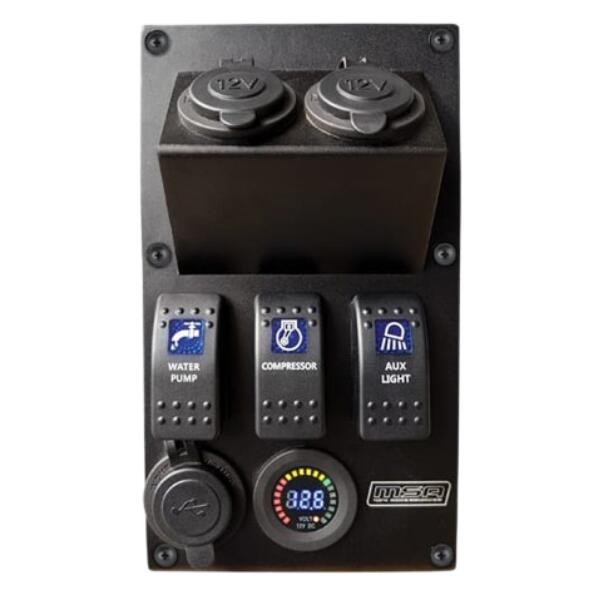 MSA 4×4 Left Power Panel (Passenger Side), 5 Years Warranty. These pre-wired, 3-Way Power Panels are designed to replace the Wing Face Plates and attach them to the Wing Kit Brackets on the sides of an MSA 4X4 Storage Drawer System. Creating a perfectly flush finish and include: 3 x labelled, illuminated Rocker switches (Water Pump, Compressor and Aux Light) and 2 spare switch covers (1 x Fridge and 1 x Inverter) 2 Port 4.2A (combined) USB charging outlets 2 x cigarette lighter sockets Illuminated auxiliary battery voltage display Angled sockets to suit being installed on the front of a set of drawers, so that accessory plugs in use, do not hit the vehicle tailgate or wagon doors Pre-wired for faster installation Unique injection-moulded backing plate which protects the back of the switches and wiring from loose items stored under the Storage Drawer Wings