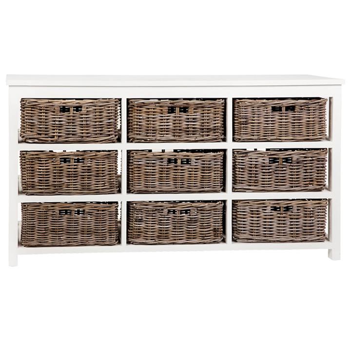 Rosslyn Mahogany Timber & Rattan Basket Storage Shelf, 3×3 Baskets